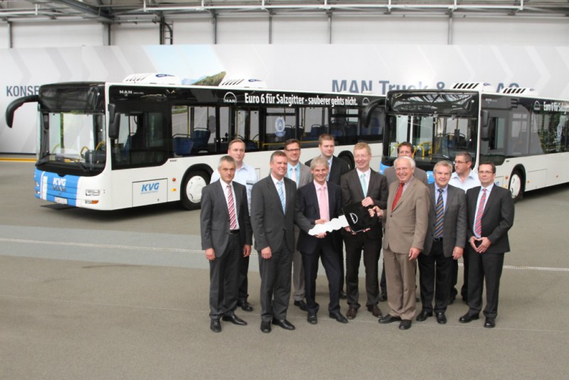 Die MAN Lion´s City Stadtlinienbusse in Euro 6-Ausführung wurden im MAN Busauslieferungs-Center Nord in Salzgitter an die KVG mbH Braunschweig überreicht. Axel Gierga, Geschäftsführer der KVG mbH Braunschweig, nahm die Fahrzeuge im Beisein von Frank Klingebiel, Oberbürgermeister der Stadt Salzgitter, entgegen. Kunden können ab sofort ihre Busse auch im MAN Kundencenter in Salzgitter abholen, worüber sich Klingebiel besonders freut: „Der MAN Standort Salzgitter wird mit der Funktion als Busauslieferungs-Center deutlich gestärkt. Und das ist gut für unsere heimische Wirtschaft. Busse aus Salzgitter in Empfang zu nehmen ist für Kunden im Omnibusgewerbe eine alte Tradition, die noch in guter Erinnerung ist.“