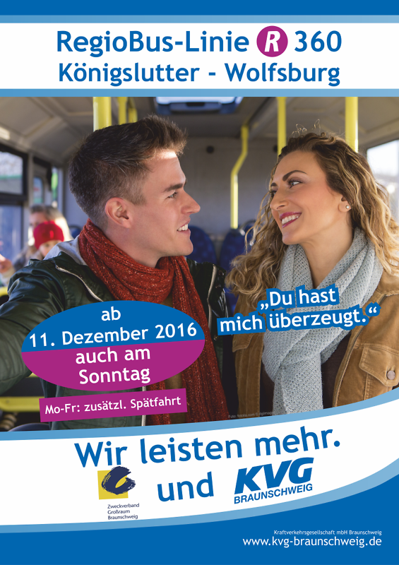Am 11. Dezember 2016 tritt auf den Buslinien 360, 370, 372, 380, 382, 393 und 394 der Kraftverkehrsgesellschaft mbH Braunschweig (KVG) im Verkehrsgebiet Helmstedt ein neuer Fahrplan in Kraft. Auf der RegioBus-Linie 360 bietet die KVG mit sechs Fahrten je Richtung erstmals einen Linienverkehr an Sonn- und Feiertagen an. Außerdem richtet die KVG auf der einzigen direkten Busverbindung zwischen Königslutter und Wolfsburg von Montag bis Freitag ein zusätzliches Fahrtenpaar am Abend ein. Die KVG berücksichtigt damit durch den Zweckverband Großraum Braunschweig (ZGB) beauftragte Zusatzleistungen auf Basis des neuen Nahverkehrsplans.