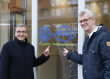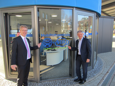 Axel Gierga (KVG-Geschäftsführer) und Frank Klingebiel (Oberbürgermeister der Stadt Salzgitter) machen vor der Mobilitätszentrale Salzgitter auf die ÖPNV-Klimaschutzkampagne der KVG aufmerksam.