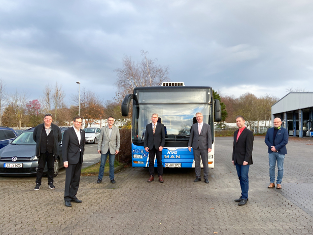 Foto: Die Teilnehmer der Behördengruppensitzung vom 14.12.2020: v.l.: Herr Bode (Stadt Helmstedt), Herr Foraita (Stadtbetriebe GmbH Wolfenbüttel), Herr Kloß (Regionalverband Großraum Braunschweig), Herr Flügge (Versorgungs- und Verkehrsgesellschaft mbH Salzgitter) Herr Gierga (KVG-Geschäftsführer), Herr Simon (Stadt Bad Harzburg), Herr Siegert ( Landkreis Helmstedt)