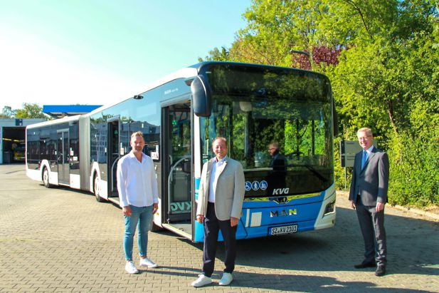 Foto:©KVG intern: v.l. Stefan Wolter (stellv. Betriebsleiter Salzgitter und Wolfenbüttel), Dirk Reese (Betriebsleiter Salzgitter und Wolfenbüttel) und Axel Gierga (KVG-Geschäftsführer) freuen sich auf die neuen Hybridbusse des langjährigen Partners MAN.