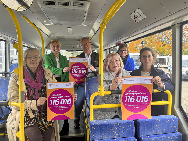 Dazu haben sich die vier Gleichstellungsbeauftragten aus den Städten und Landkreisen Goslar, Wolfenbüttel und Salzgitter, Kathrin Falkner, Vera Tietz, Simone Reese, Carolin Wiek, sowie Simone Semmler zusammengetan und führen eine gemeinsame Kampagne mit der Kraftverkehrsgesellschaft mbH Braunschweig (KVG) im öffentlichen Nahverkehr durch.
