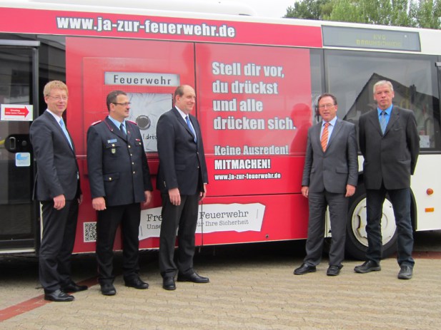 Ab sofort kämpfen der Landkreis Helmstedt und die Kraftverkehrsgesellschaft (KVG) mbH Braunschweig gemeinsam gegen sinkende Mitgliederzahlen bei den Freiwilligen Feuerwehren. Am 24. September 2013gaben Landrat Matthias Wunderling-Weilbier, Kreisbrandmeister Olaf Kapke und KVG-Geschäftsführer Axel Gierga auf dem Gelände der Feuerwehrtechnischen Zentrale Helmstedt den offiziellen Startschuss für den so genannten „Feuerwehr-Bus“. Dieser ist das neueste Element einer landesweiten Kampagne unter dem Motto „Ja zur Feuerwehr“.