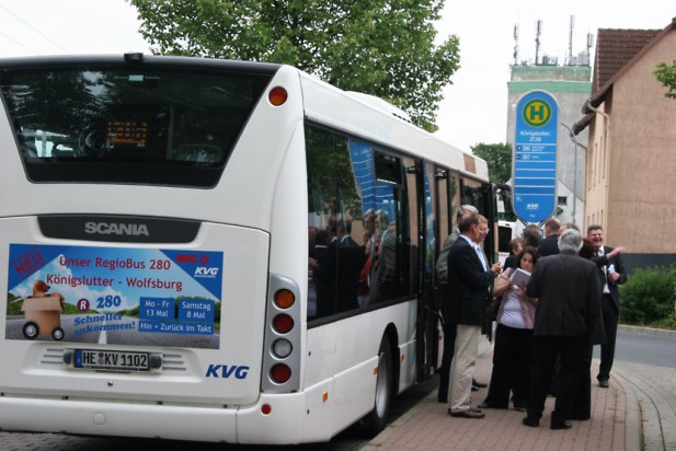 Die neue RegioBus-Linie 280 (R 280) zwischen Königslutter und Wolfsburg hat am 8. August 2013 den Betrieb aufgenommen. Betreiber der Linie sind die Verkehrsgesellschaften Kraftverkehrsgesellschaft mbH Braunschweig (KVG) und Wolfsburger Verkehrs-GmbH (WVG). Maßgeblich an der Planung und Finanzierung der Buslinie beteiligt ist der Aufgabenträger für den öffentlichen Personennahverkehr (ÖPNV), der Zweckverband Großraum Brauschweig (ZGB). Oberbürgermeister Klaus Mohrs der Stadt Wolfsburg, Bürgermeister Alexander Hoppe der Stadt Königslutter und Landrat Matthias Wunderling-Weilbier des Landkreises Helmstedt informierten sich während einer der ersten Fahrten der RegioBus-Linie 280 bei Axel Gierga, Geschäftsführer der KVG, Heiko Hansen, Geschäftsführer der WVG, und Hennig Brandes, Verbandsdirektor des ZGB, über das neue Verkehrsangebot.