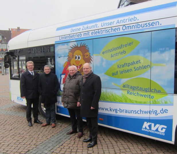 Die Kraftverkehrsgesellschaft mbH Braunschweig (KVG) stößt das Tor zur Elektromobilität im Linienbetrieb weit auf: Erstmals gehören Busse mit schadstofffreiem Antrieb zum Fuhrpark des Unternehmens. Diese wurden am 07. Februar 2017 auf dem Stadtmarkt Wolfenbüttel offiziell in Dienst gestellt. Die landesgeförderten Elektrofahrzeuge nahm Ministerialdirigent Dr. Christoph Wilk, vom Niedersächsischen Ministerium für Wirtschaft, Arbeit und Verkehr, Abteilungsleiter Verkehr, persönlich in Augenschein. Mit ihm ließen sich weitere Vertreter aus Politik und Gremien die neue Antriebstechnik erläutern. Zudem nutzten sie die Möglichkeit zu einer Testfahrt durch das Stadtgebiet Wolfenbüttel. Von den drei beschafften Elektrobussen des Herstellers Sileo aus Salzgitter setzt die KVG je ein Fahrzeug im Linienbetrieb des Stadtverkehrs Wolfenbüttel, Salzgitter und Helmstedt ein. Deren garantierte Reichweite pro Batterieladung beträgt mehr als 200 km.