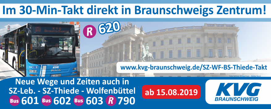 Die RegioBuslinie 620 verbindet SZ-Thiede und Braunschweig ab dem Schuljahresbeginn exklusiv. Die Linie 602 verkehrt nicht mehr auf ihrem bisherigen Fahrtverlauf. Sie übernimmt die Relation zwischen SZ-Leb. und SZ-Thiede von der „alten“ Linie 620. Die neu getaktete RegioBuslinie 620 verkehrt von Montag bis Freitag tagsüber leicht merkbar alle 30 Minuten. Zu späterer Stunde sowie am Samstag und Sonntag fährt sie nach einem 60-Minuten-Takt. In SZ-Thiede erfolgt zwischen den Linien 602 und 620 ein automatischer Linienwechsel. Dadurch sind Fahrgäste zwischen SZ-Leb. und Braunschweig weiterhin immer umsteigefrei unterwegs. Zudem weitet die KVG das Fahrplanangebot zwischen SZ-Leb. und SZ-Thiede aus. Die Linie 602 verkehrt nun an allen Wochentagen im 60-Minuten-Takt.