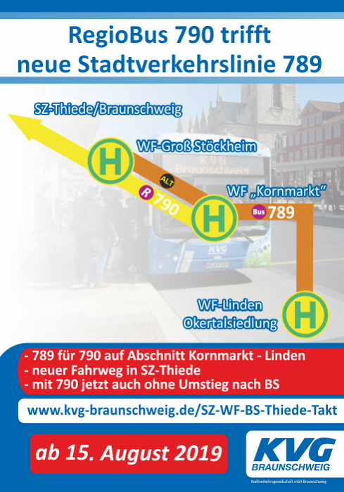 Zum Schuljahresbeginn am 15. August 2019 führt die KVG auf den von/nach SZ-Thiede verkehrenden Buslinien 602, 603, 620 und 790 einen neuen Taktfahrplan ein. Dadurch werden SZ-Thiede, SZ-Leb. und Braunschweig auch auf neuen Fahrwegen erschlossen. Die RegioBuslinie 790 erhält einen beschleunigten Linienverlauf. Daher übernimmt in Wolfenbüttel die neue Stadtverkehrslinie 789 den Abschnitt zwischen „Kornmarkt“ und „WF-Linden, Okertalsiedlung“ von der bisher in dem Bereich fahrenden Linie 790.