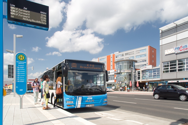 In der Innenstadt von SZ-Lebenstedt können sich die Fahrgäste seit dem 14. Dezember 2014 über kurze Wege beim Umsteigen freuen: Die KVG-Busse fahren erstmalig die neue Bushaltestelle „SZ-Lebenstedt, Bahnhof“ an. Die Stadt Salzgitter hat den Haltepunkt zu einer neuen zentralen Haltestelle mit vier barrierefreien Bussteigen umgebaut. Am Haltepunkt werden alle Buslinien zentral zusammengefasst. Zudem machen vier moderne dynamische Fahrgastinformationsanzeiger zur Echtzeitanzeige der Busabfahrten das Fahren mit den Bussen der KVG attraktiver und informativer.