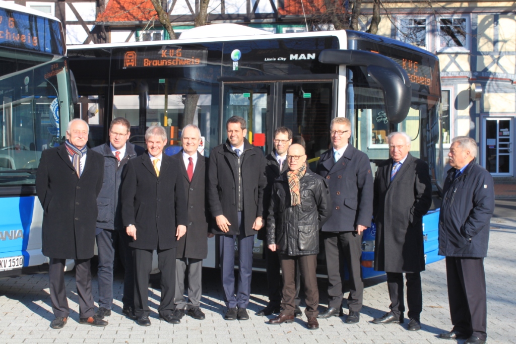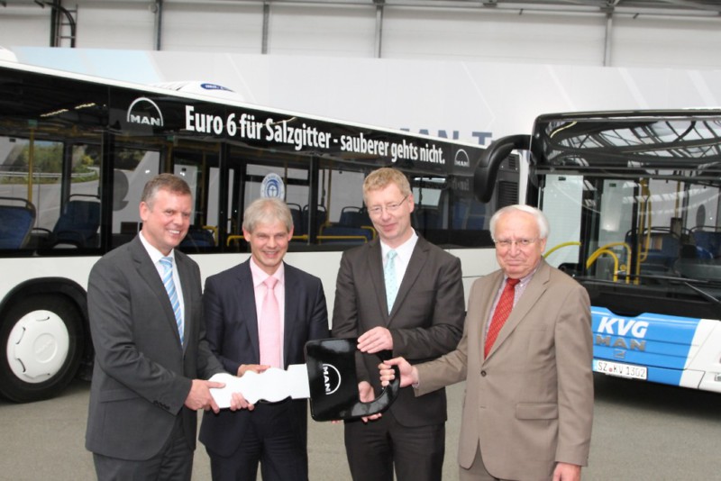 Als erster deutscher MAN-Kunde setzt die KVG auf MAN Lion´s City Stadtbusse mit einem umweltschonenden Euro-6-Motor. Die Fahrzeuge reduzieren die CO2-Emissionen signifikant im Vergleich zur bisherigen Motorengeneration. Der Ausstoß von Stickoxiden wird im Vergleich zur zuvor geltenden Norm Euro 5 um 80 Prozent gesenkt und der Partikelausstoß um weitere 66 Prozent verringert. Die MAN Lion´s City Stadtlinienbusse in Euro 6-Ausführung wurden am 29. Mai 2013 im MAN Busauslieferungs-Center Nord in Salzgitter an die KVG übergeben. Axel Gierga, Geschäftsführer der KVG mbH Braunschweig, nahm die Fahrzeuge im Beisein von Frank Klingebiel, Oberbürgermeister der Stadt Salzgitter, und KVG Aufsichtsratsvorsitzendem Rolf Stratmann entgegen.