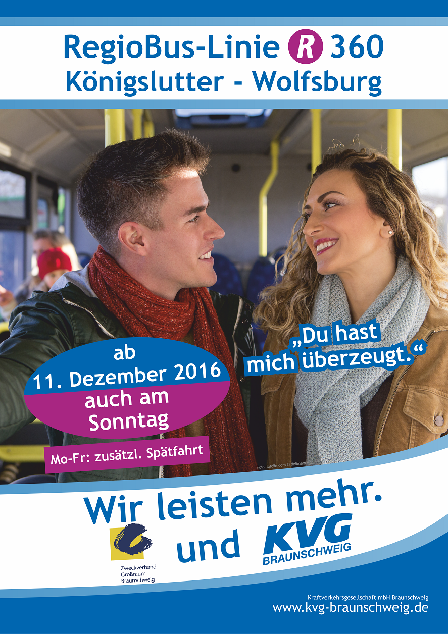 Zum Fahrplanwechseltermin am 11. Dezember 2016 richtet die Kraftverkehrsgesellschaft mbH Braunschweig (KVG) auf der RegioBus-Linie 710 (Wolfenbüttel − Winnigstedt) von Montag bis Samstag zusätzliche Fahrten zur Verdichtung des Fahrplans ein. Auf der RegioBus-Linie 360 (Königslutter - Wolfsburg) bietet die KVG mit sechs Fahrten je Richtung erstmals einen Linienverkehr an Sonn- und Feiertagen an. Außerdem richtet die KVG auf der einzigen direkten Busverbindung zwischen Königslutter und Wolfsburg von Montag bis Freitag ein zusätzliches Fahrtenpaar am Abend ein. Die KVG berücksichtigt damit durch den ZGB beauftragte Zusatzleistungen auf Basis des neuen Nahverkehrsplans.