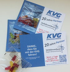 20-jähriges Jubiläum des VRB - KVG ist 20 Jahre Partner: Seit dem Start am 01. November 1998 können ÖPNV-Fahrgäste im Großraum Braunschweig auf ein einheitliches Tarifsystem mit nur vier Preisstufen zugreifen. Die KVG ist einer der 12 Partner, die von Beginn an im VRB mitwirkten. Der VRB-Start erfolgte als Verbundtarif: 2016 ist aus dem Tarifverbund ein gemeinsam agierender Verkehrsverbund Region Braunschwieg geworden. Anlässlich des VRB-Geburtstages bedankte sich die KVG mit kleinen Aufmerksamkeiten und einem Jubiläumsgewinnspiel bei allen Kunden.