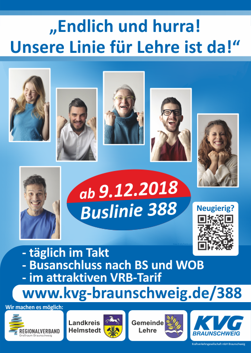 Endlich und hurra - Zum 9. Dezember 2018 haben die KVG und der Regionalverband Großraum Braunschweig die Buslinie 388 als neues Verkehrsangebot zwischen mehreren Ortsteilen der Gemeinde Lehre eingerichtet. Sie verkehrt täglich nach einem leicht merkbaren Taktfahrplan. Zudem stellt die Buslinie 388 an der Haltestelle „Lehre, Rathaus“ einen Anschluss zur RegioBus-Linie 230 von/nach Braunschweig sowie Wolfsburg und den weiteren Ortsteilen der Gemeinde Lehre her.