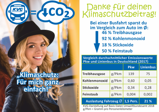 Ein Vergleich der Emissionswerte verschiedener Verkehrsmittel durch das Umweltbundesamt macht deutlich: Wer den ÖPNV nutzt, spart bei einer Linienbusfahrt im Vergleich zum Auto durchschnittlich 46 % Treibhausgase (darunter CO2), 92 % Kohlenmonoxid, 18 % Stickoxide und 50 % Feinstaub ein. Jeder zusätzliche Fahrgast steigert den Umweltvorteil. Ab sofort macht ein Hinweis auf den von der KVG ausgegebenen Zeitfahrausweisen (Monats- und Wochenkarten) darauf aufmerksam, um unter den Fahrgästen starke Fürsprecher für den umweltfreundlichen ÖPNV zu gewinnen. Mit Folien auf Fahrzeugen und an den Mobilitätszentralen heißen wir CO2-Sparer willkommen.