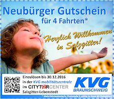 Schneiden Sie diese Anzeige aus und legen Sie diese bei uns in der mobilitätszentrale im CityTorCenter vor. Sie erhalten dafür zwei 2er-Karten der Preisstufe 1 für das Stadtgebiet Salzgitter (Zone 60). Damit können Sie 4 Fahrten innerhalb der Stadtgrenzen von Salzgitter in unseren Linienbussen unternehmen. Bitte entwerten Sie vor Fahrtantritt jeweils einen Abschnitt ihrer Mehrfahrtenkarte im Entwerter. Der einzelne Abschnitt hat eine Gültigkeit von 90 Minuten.