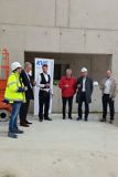 Nach den Reden schlugen Frank Klingebiel, KVG-Betriebsleiter Dirk Reese in Vertretung für KVG-Projektleiter Ramon Wunsch, Stefan Klein und Architekt Andreas Niehüser (n³a) symbolisch mit ihren Namen gravierte Unterlegscheiben in eine Wand des Neubaus. Danach sprach Dachdeckermeister Seraphin Heinecke den traditionellen Richtspruch und gemeinsam wurde auf den Neubau angestoßen. Anschließend hissten Dirk Reese und Axel Gierga feierlich den Richtkranz – musikalisch begleitet von KVG-Verkehrsmeisterin Mandy Borchers, die dazu stimmungsvoll Trompete spielte.